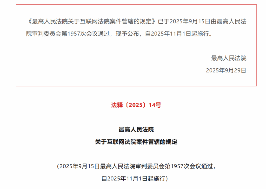 On October 10, 2025, China’s Supreme People’s Court (SPC) released the Provisions of the Supreme People’s Court on the Jurisdiction of Internet Courts (最高人民法院关于互联网法院案件管辖的规定) effective November 1, 2025. The 2025 Provisions amend the 2018 Provisions by removing Internet Courts’ jurisdiction over five types of cases including “copyright or neighboring rights disputes involving works first published online,” and “disputes arising from infringement of copyright or neighboring rights in works published or disseminated online.” The SPC explained that this will ensure “new, cutting-edge, and complex online cases are heard by the Internet Courts” while “general and traditional online cases are heard by other local courts.”